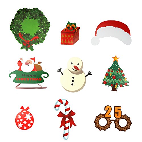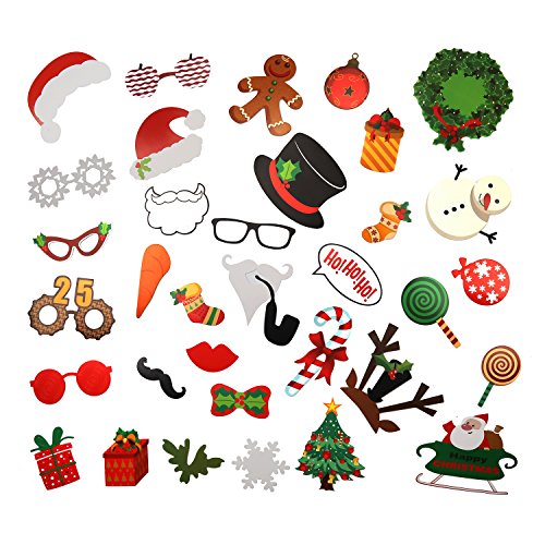 - PACKAGE INCLUDES – This kit comes with 34 different adorable props. Including Christmas trees, Snowman, Glasses, Moustache, Red Lips, Deer Horn, Santa, Hat, Wreaths, Carrots and so on.