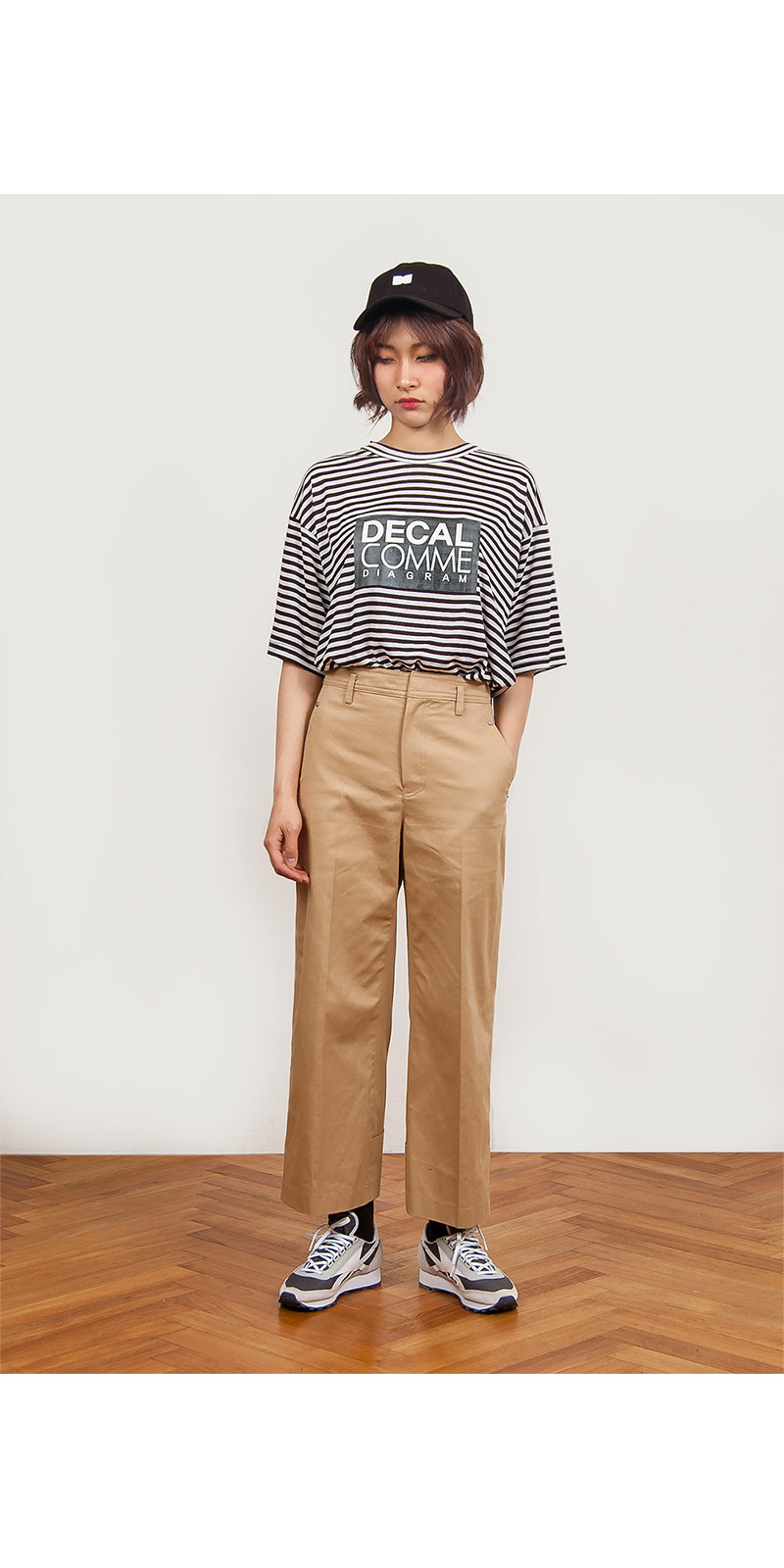 어깨가 살짝 드롭되는 라인의 품감이 100이 조금 넘는 사이즈의 티셔츠 입니다.스트라이프의 베이스 원단에 브랜드 로고가 프린트 되어져 있으며,하의에 넣어서 연출하거나 빼내어 연출할 수 있도록 총장을 70cm 엉덩이를 살짝덥는 기장으로 디자인 하였습니다.
