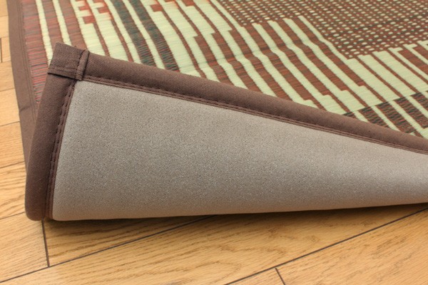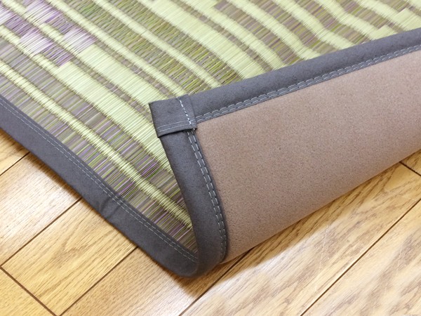 通常畳表に使用するような良質な長い(約120cmの)イ草を使用しました。イ草は長いものほど高級になります。イ草は先端部分が赤茶色く、根元が白く、真中が青(緑)色です。真中の良質な青の部分を多く使用するほど丈夫で綺麗な仕上がりとなります。また、イ草は使用するうちに日焼けしますが、真中の青の部分を多く使用したものほど、全体が綺麗にムラ無く日焼けし、味が出ます。国産(九州産)のい草を使用しています。一本一本が太く、表皮が厚く繊維がキメ細かいので弾力性があり、耐久性に優れています。また使用していくうちに綺麗な黄金色に変化していきます。い草には空気の清浄化作用、湿度の調節作用があり、汚れにくいといった特徴があります。青森ヒバ加工を施しています。(抗菌、防臭効果)また、裏にはウレタンを貼っていますので、フローリングでのご使用にも適しています。