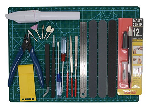 -. Feature : 16 Pieces modeler tools set is suitable for a starter and Professional modeler as well / 1xSide cutter,1x Pen knife& blade and sawblade File 2 type Tweezer. double-sided polished bar / 1xbox,1xcutting mat.,1xsmall rotary tool / Cutting mat:9 x 12" A4 size; Thick( 1.2" ) Durable Double Sided Builder's Cutting Mat / 100% Money back gaurantee