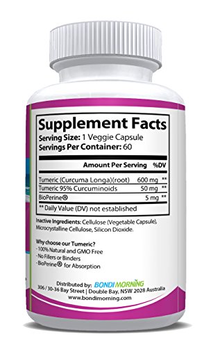 Highest Potency Bondi Morning Turmeric Capsules have one of the highest levels of Turmeric Curcumin per capsule ? 600mg, and contain the highest concentration of Standardized Turmeric Curcuminoids ? 95%. Made in USA Bondi Morning Turmeric Curcumin capsules are made in USA, in FDA inspected and approved facility, and follow GMP guidelines to the letter. 100% Natural Bondi Morning Turmeric is 100% natural, GMO free, gluten free and does not contain any kind of artificial additives, preservatives, fillers or binders. 100% Satisfaction Guarantee We are 100% confident you will love our product but if for any reason you do not simply return it to Amazon and get 100% money back…no questions asked. Health Benefits of Turmeric Curcumin - Reduces inflammation.