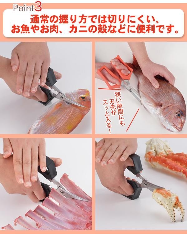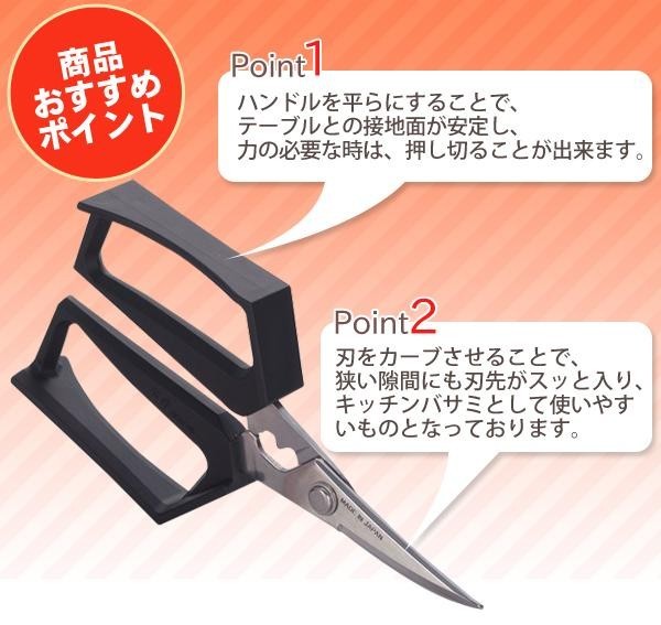 ハンドルを平らにすることで、テーブルとの接地面が安定し、力の必要な時は、押し切ることが出来ます。刃をカーブさせることで、狭い隙間にも刃先がスッと入り、キッチンバサミとして使いやすいものとなっております。通常の握り方では切りにくい、お魚屋お肉、カニの殻などに便利です。水洗い後の水切りや、一時置きで横向きに立てられます。 |