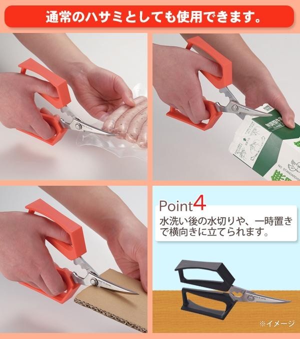 | ハンドルを平らにすることで、テーブルとの接地面が安定し、力の必要な時は、押し切ることが出来ます。刃をカーブさせることで、狭い隙間にも刃先がスッと入り、キッチンバサミとして使いやすいものとなっております。通常の握り方では切りにくい、お魚屋お肉、カニの殻などに便利です。水洗い後の水切りや、一時置きで横向きに立てられます。 |