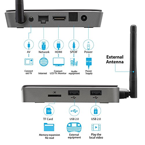 Product Dimension Length 115mm Width 120mm Depth 23mm Hardware Specifications Chipset AML S905X Quad-Core ARM Cortex-A53 up to 1.5GHz GPU Penta-Core ARM Mali-450 up to 750Mhz Storage 16GB EMMC Memory 1GB DDR3 Output Resolution 4K x 2K up to 60fps OS Android 6.0.1 VideoAudio Format Video Decoder VP9/H.265 up to 4Kx2K@60fps, H.264/MPEG-1/2/4 VC-1/AVS/RealVideo up to 1080p@60fps Support Video Format mkv/wmv/mpg/mpeg/dat/avi/mov/iso/mp4/rm Audio Decoder MP3/AAC/WMA/RM/FLAC/OGG Support Photo format HD JPEG/BMP/GIF/PNG/TIFF OSD type of languages English/French/German/Spanish/Italian/ etc multilateral languages Output Input USB host 2 High speed USB 2.0 (1 OTG and 1 HOST), support USB Flash Drive and USB HDD Card reader SD/SDHC/MMC cards HDMI HDMI 2.0a With 3D,HDR,CEC and 4Kx2K@60fps max resolution LAN 10/100M standard RJ-45 Ethernet Wireless 802.11ac/a/b/g/n Dual Band Wi-F AV Support Stereo Audio and CVBS 480i/576i SD Video SPDIF Support Optical Output Others Power Supply DC 5V/2A Accessory Remote control, User manual, Power supply, HDMI cable Option: Support mouse and keyboard via USB or BT;Support 2.4GHz wireless mouse and keyboard via 2.4GH 0