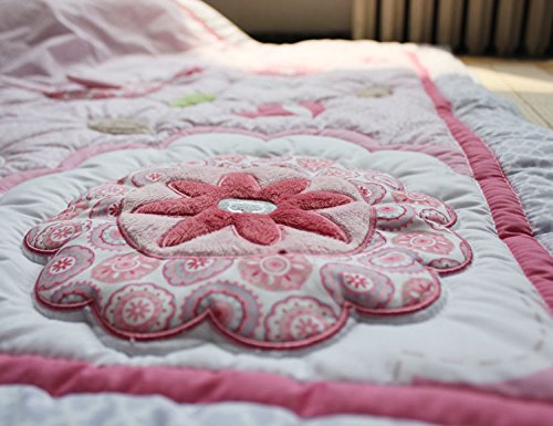 -. Feature : 8-pcs set includes:(1)quilt, (4)bumper pads, (1) fitted sheet, (1)dust ruffle(skirt), (1)musical mobile / Hand sew-on pattern, / Thread Count: 200 / Material: Cotton, Polyester / (musical mobile will be sent seperaterly from other warehouse)