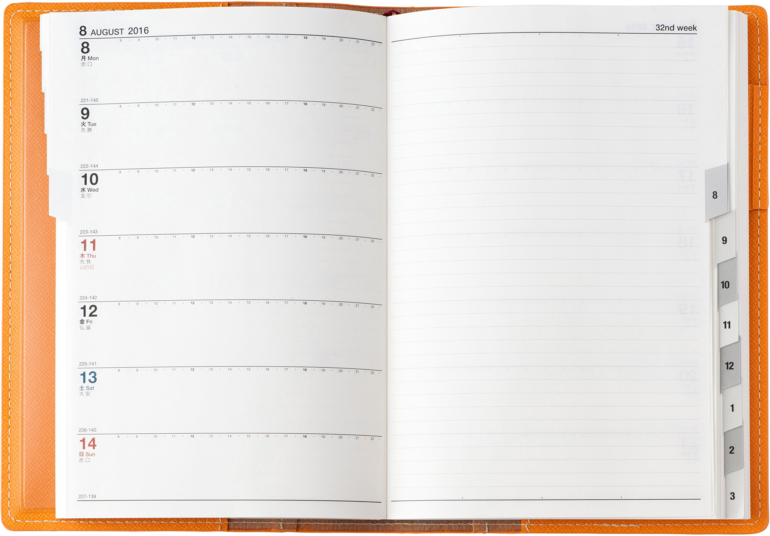 The left page is a schedule section for one week, the right page is free sideways keimemo.