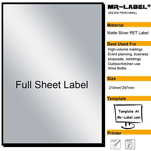 Mr-Label® Extra Large Full-Sheet Matte Silver Label Adhesive Labels – Scratchproof Waterproof Stickers for Company Information | Wine Bottle - Laser Print Only (25 Sheets)