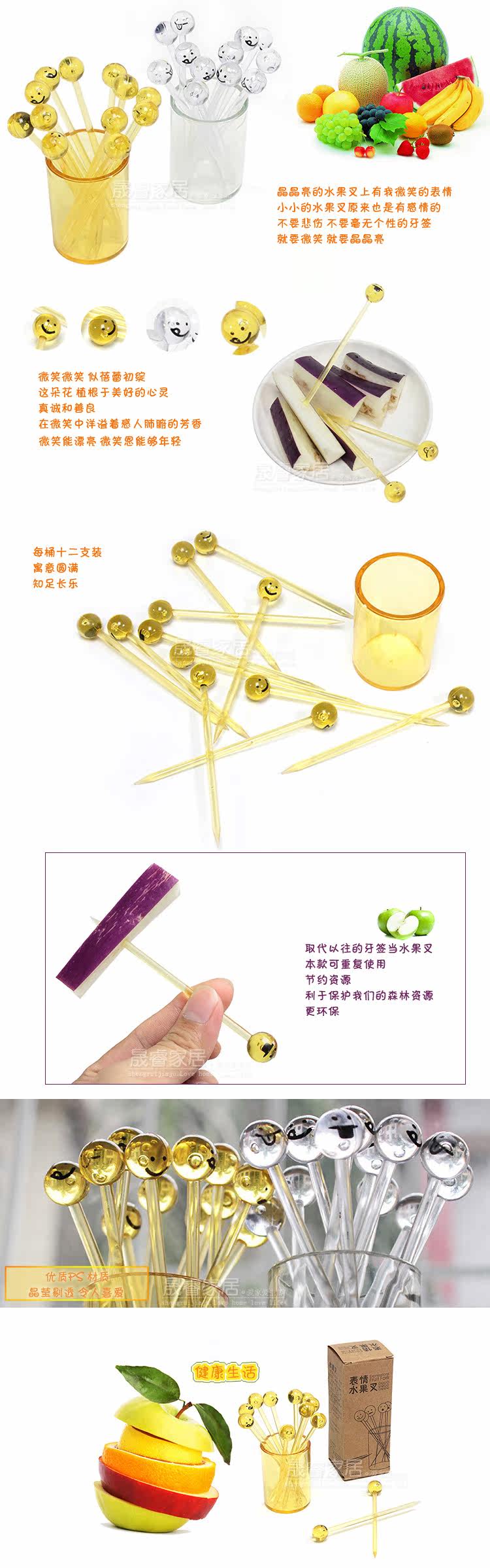 Have my smiling face on sparkling fruit fork? joy? anger? sadness and joy? lovely expression of fruit fork for your express inner feelings? let the cute little things to share with you a delicious fruit. A set of 12 forks plus a cup. Small fruit fork originally have feelings. Do not be sad? do no personality toothpick? we must smile? we must fascinating. Reusable? conducive to the protection of our forest resources? more environmentally friendly.