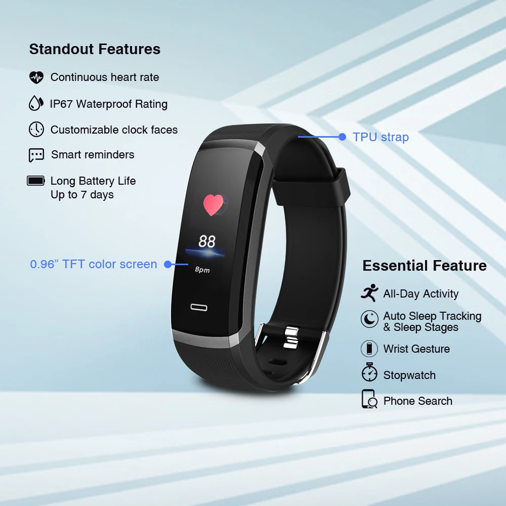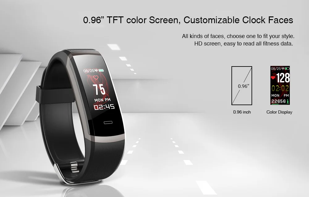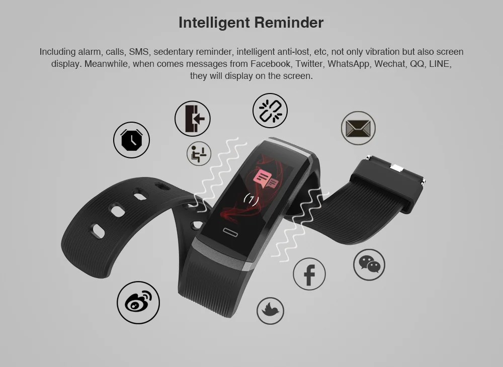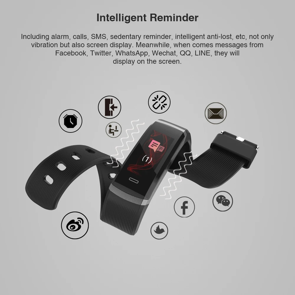 Function:Message Reminder,Passometer,Alarm Clock,Activity Tracker,Fitness Tracker,Call Reminder,Sleep Tracker,Heart Rate Tracker,Push Message,Social Media Notifications