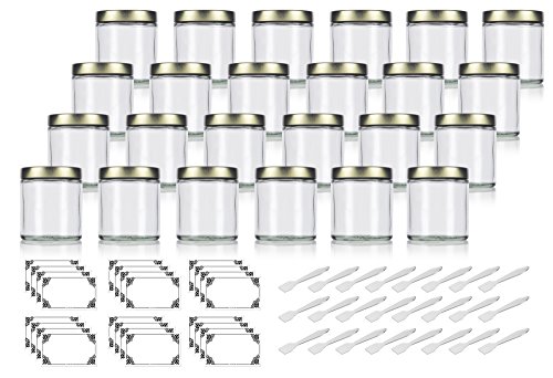 - Includes 24 - 4 oz / 120 ml Clear Glass Straight Sided Jars with Metal Foam Lined Lids + Spatulas and Labels