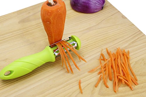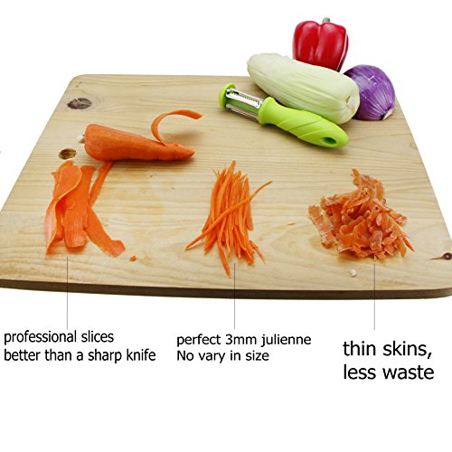 Multi-function - Peeling vegetables and fruits with our SUPER sharp vegetable peeling blade. Slicing the potatoes, pears, carrots, cheese, cucumbers and zucchinis with the sharp serrated blade. MOREOVER, use the tooth sharp blade to create perfectly sized Julienne pieces. Just got a WHOLE lot easier!