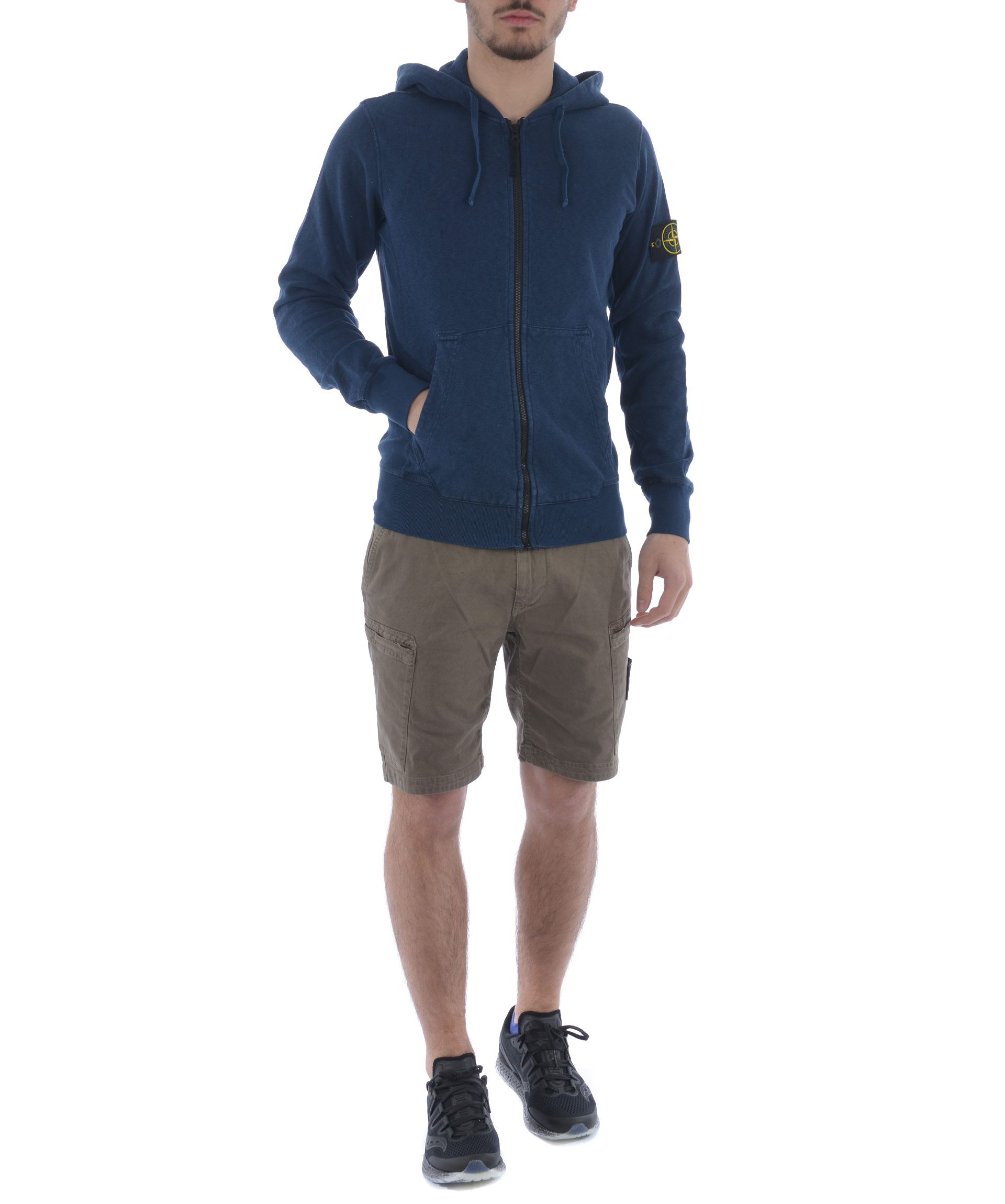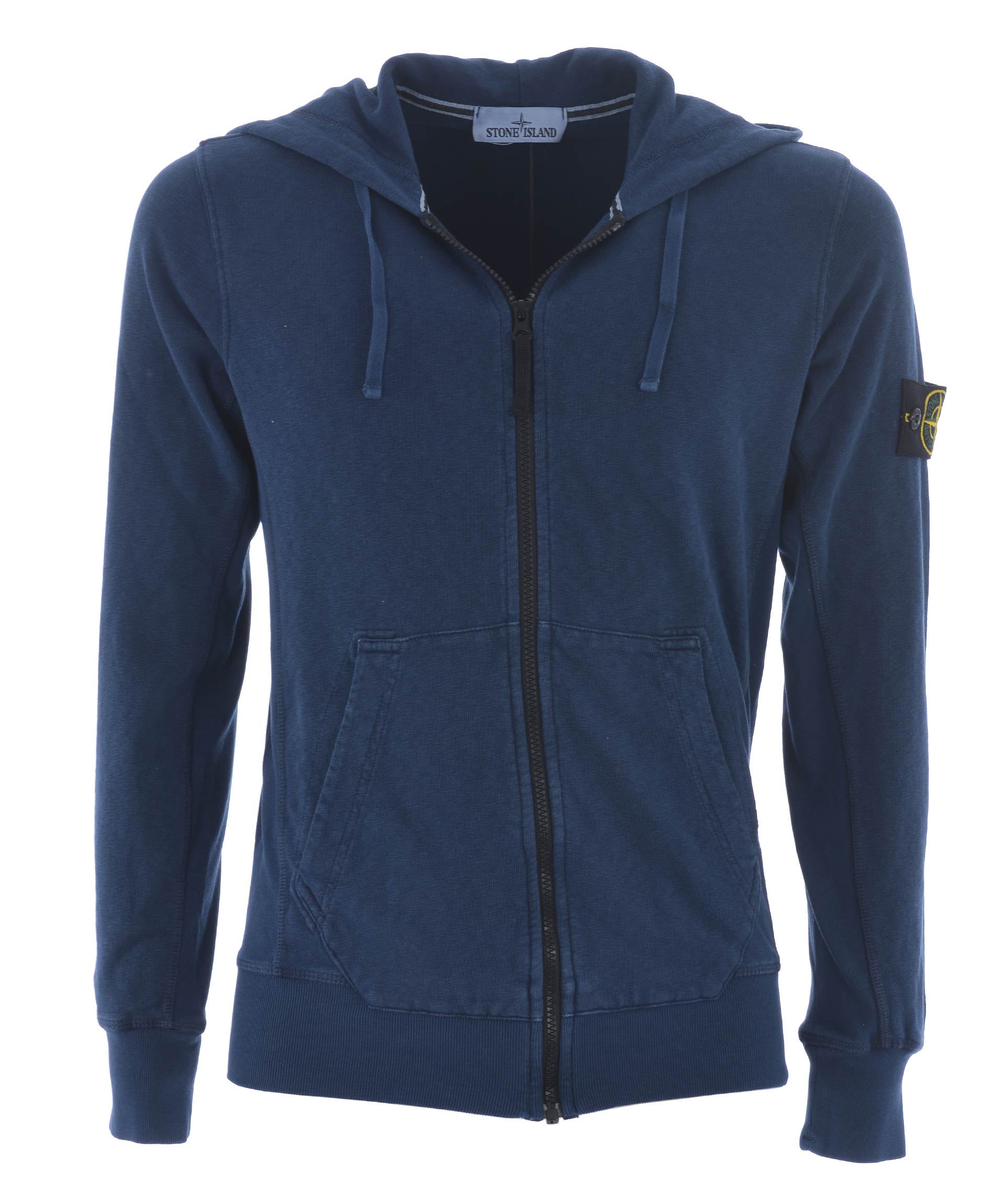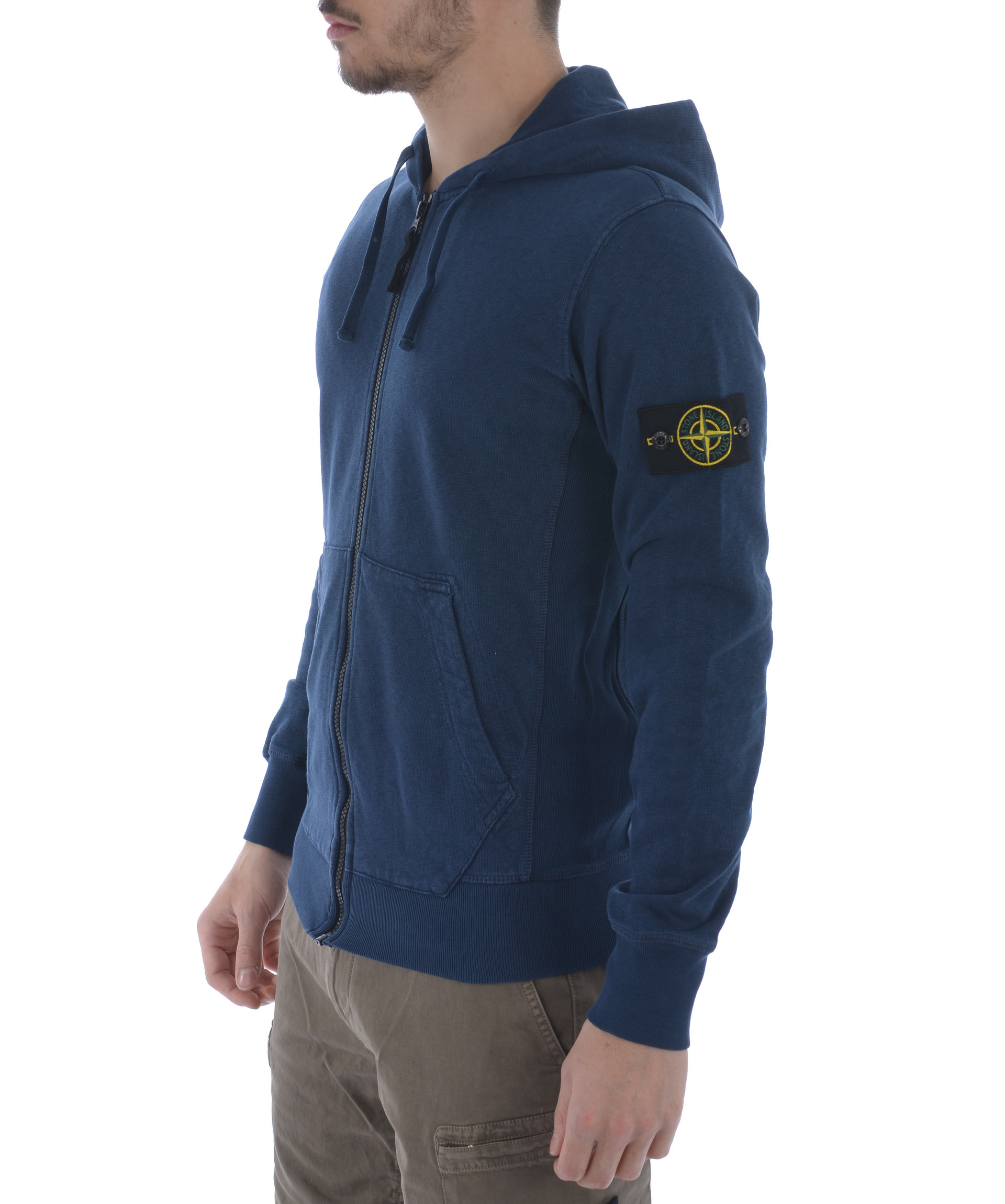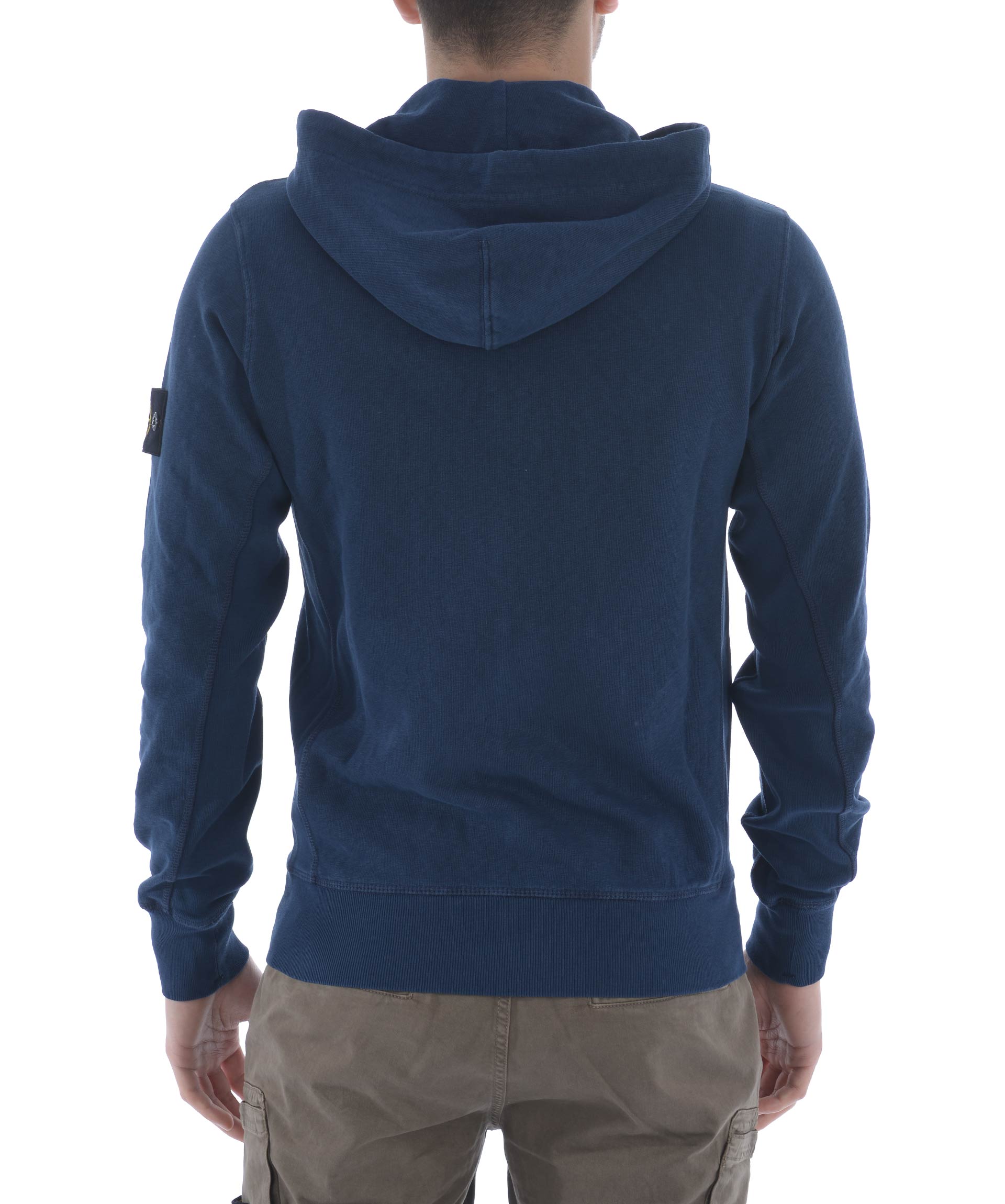 Felpa Stone Island in cotone malfilè Blu effetto old. Cappuccio con coulisse. Chiusura con zip. Tasche frontali. Polsi e fondo a costine. Patch logo in lana sulla manica sinistra, removibile. Misura in foto S 100% cotone