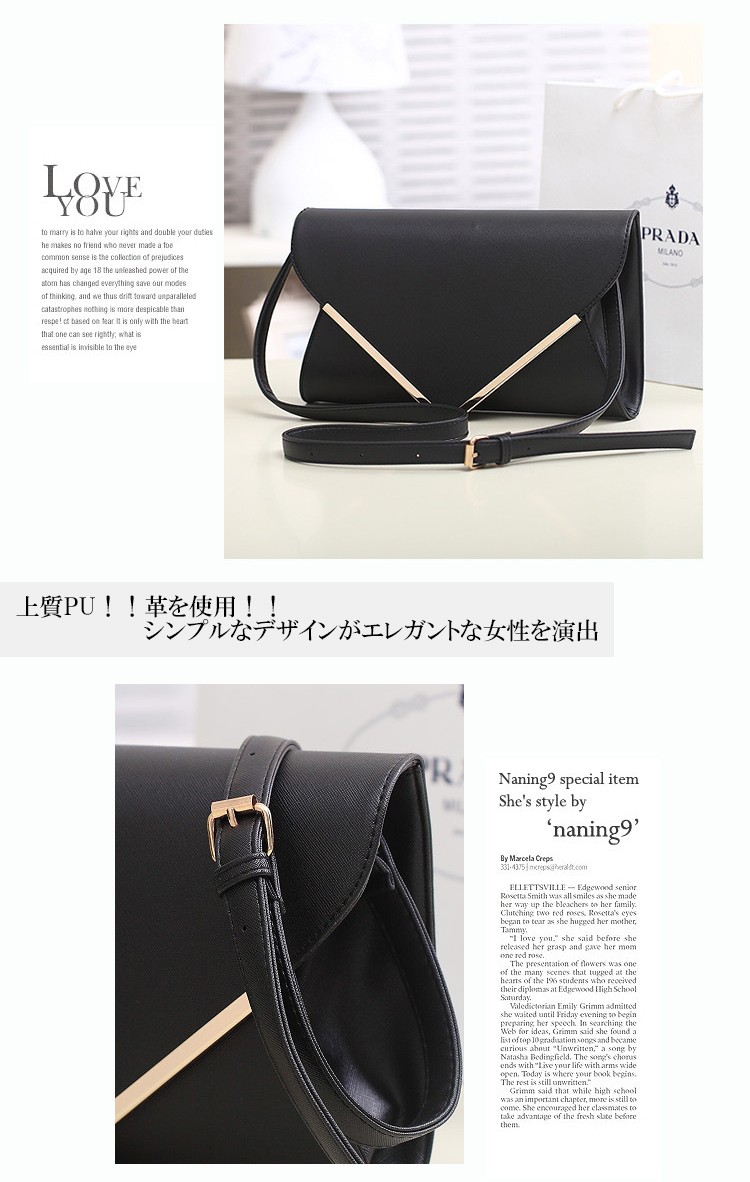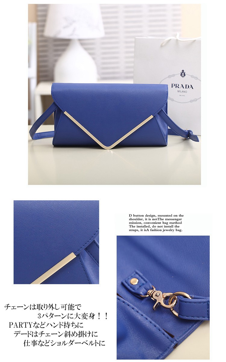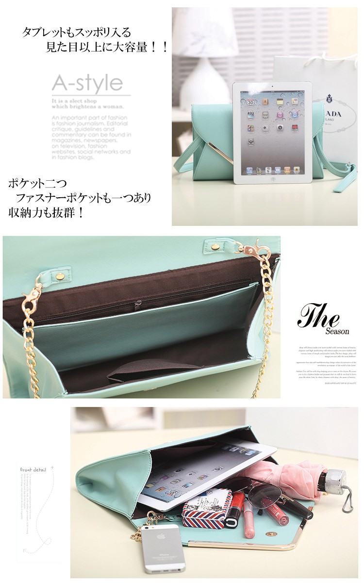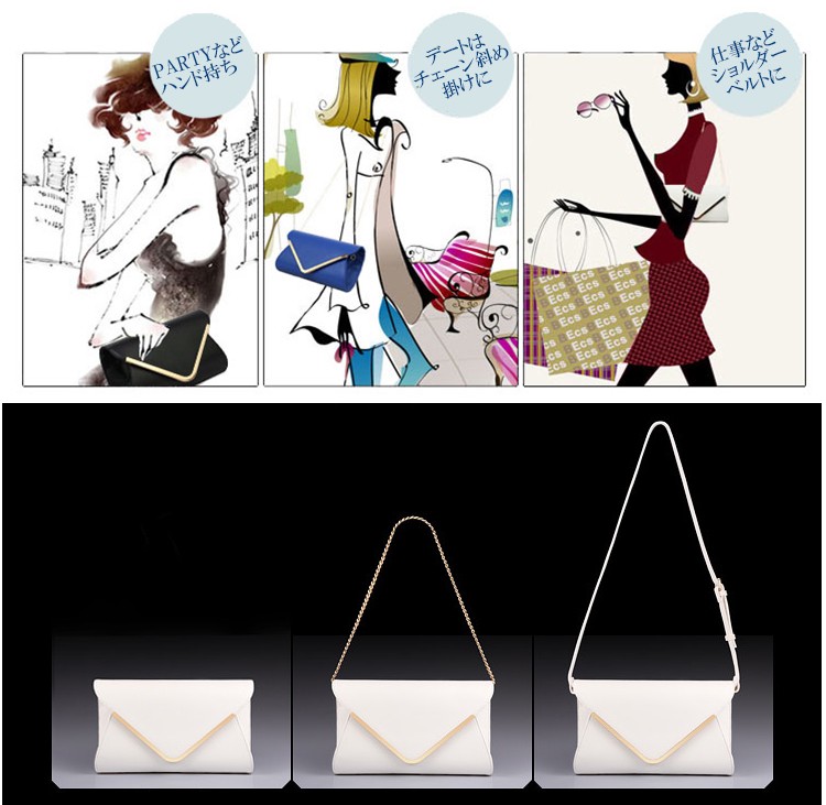 | スタッフより | 上質PU!!革を使用!!シンプルなデザインがエレガントな女性を演出してくれます。 タブレットもスッポリ入る見た目以上に大容量!! ポケット二つ、ファスナーポケットも一つあり収納力も抜群! チェーンは取り外し可能で3パターンに大変身!! PARTYなどハンド持ちにデードはチェーン斜め掛けに仕事などショルダーベルトに☆ |