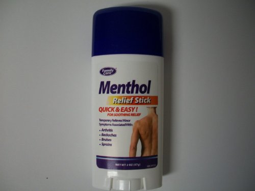 -. Binding : Health and Beauty -. Brand : Family Care -. Feature : 24 Family Care Menthol Relief Sticks / In deodorant form for clean and easy application / Quick and easy for soothing relief / Temporarily relieves minor symp associated with arthritis, backaches, bruises, and sprains -. Label : Family Care -. Manufacturer : Family Care -. ProductGroup : Health and Beauty -. ProductTypeName : HEALTH_PERSONAL_CARE -. Publisher : Family Care -. Studio : Family Care -. Title : Family Care Menthol Relief Stick Quick & Easy! For Soothing Relief 2oz (2 Pack)