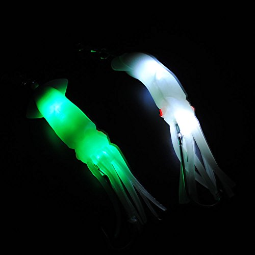 DOUBLE ATTRACTANTS: BUILT-IN LED & GLOW IN THE DARK SKIN. LED will be lighted on automatically when it hits the water with two electric poles explode to the water. Even the skirt tail will glow in dark environment. Please get the skin charged under light if the lure is under dark environment for too long.
