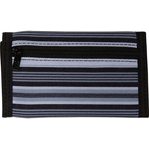Tri-fold wallet in allover print polyester featuring zip bill compartment and woven label detail