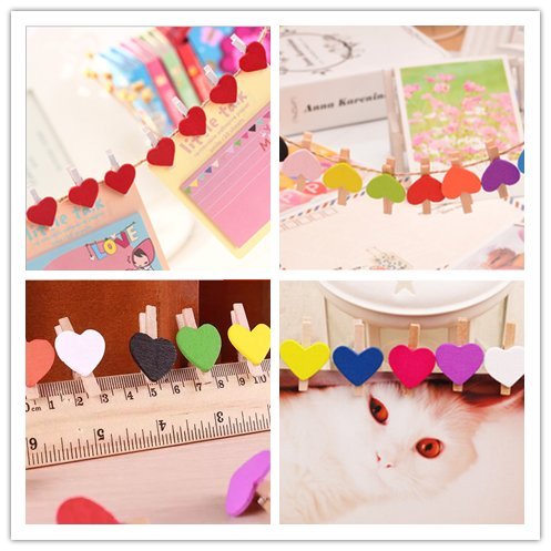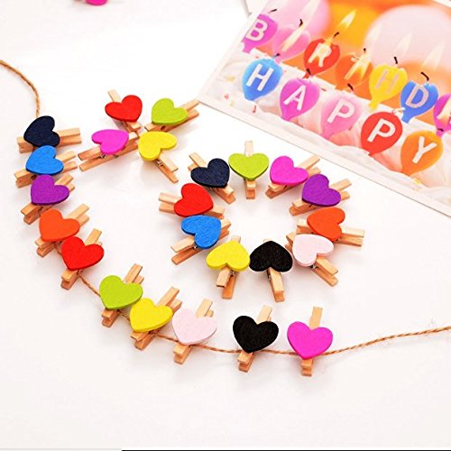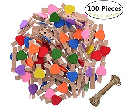 - *What you get: 100 pieces Natural Wooden Colorful Clothespins With heart shaped decoration in diverse colors and 66 feet jute twine. Durable 3-ply jute twine with evenly spun fibers can grip tightly to form knots of superior strength.