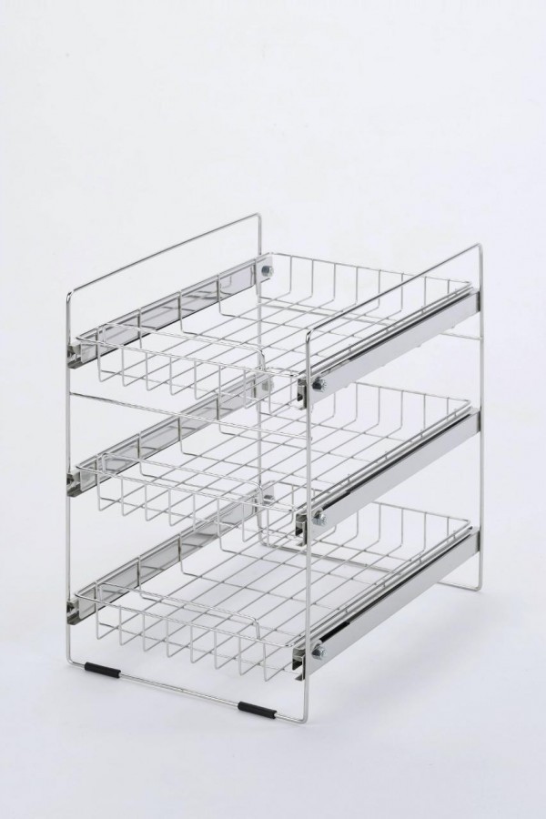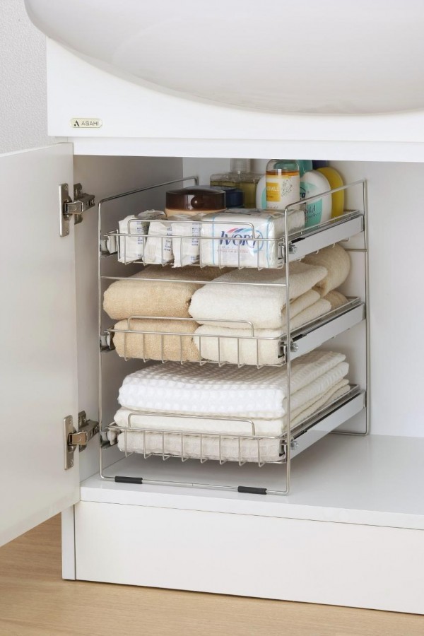 湿気の多い洗面台下に最適の18-8ステンレス製!お手入れも簡単で、永くお使いいただけます。脚元にはすべり止めのゴムクッション付き。安定性も十分です。細かく分類できる3段タイプです。洗剤や石鹸のストックに最適です! |