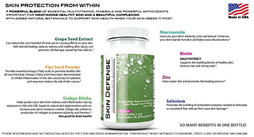 SKIN DEFENSE can help combat deficiencies and supports repair processes in MAINTAIN OPTIMUM GROWTH OF HAIR, SKIN and NAILS*. Nutrients are the critical building blocks of body structures. Even a mild deficiency can impede your body's ability to make healthy, glowing skin, thick hair and strong nails. If vital nutrients are not available, it is like building a house without all the materials and tools. When wear and tear is allowed to continue, ailments develop and magnify, and your body will not be able to keep up with maintenance against normal forces of aging and even gravity! Chemical and weather assaults can inhibit natural processes of rejuvenation. They can have a drying effect by removing natural protective oils, which can leave you exposed. Without natural moisture, skin can appear dull, dry and flaky that can enhance the appearance of those unwanted fine lines making you look older. Free radicals bombard the skin and can result in breakdown of cells, causing unwanted age spots, scarring, hyperpigmentation, wrinkles and loss of elasticity and firmness. SKIN DEFENSE contains POWERFUL ANTIOXIDANTS to help fight harmful effects on your skin by neutralizing free radical! The best Hair Skin and Nails Vitamin!