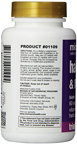 Michael's Hair, Skin and Nails Complex is a vegetarian and kosher dietary supplement formulated to aid in proper protein assimilation to boost normal hair and nail growth. Also promotes integrity of skin and connective tissue.Feature