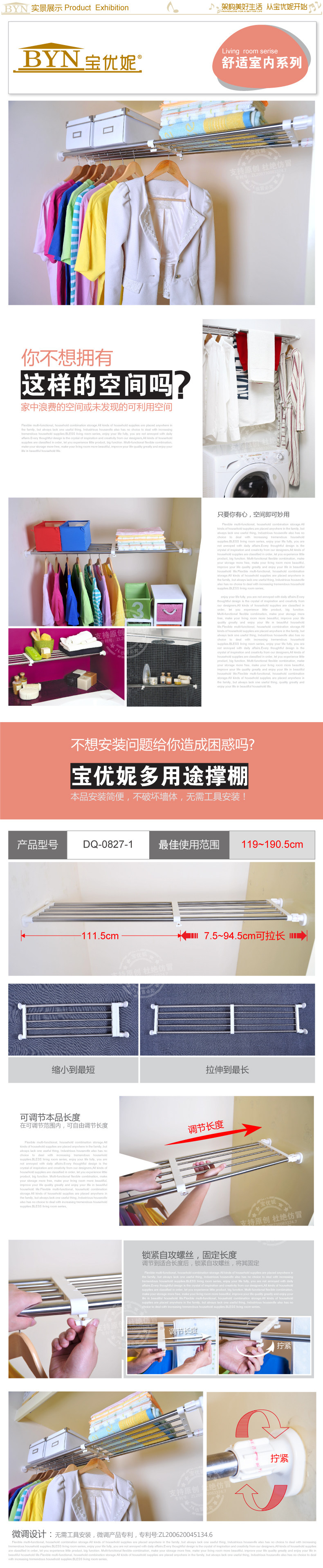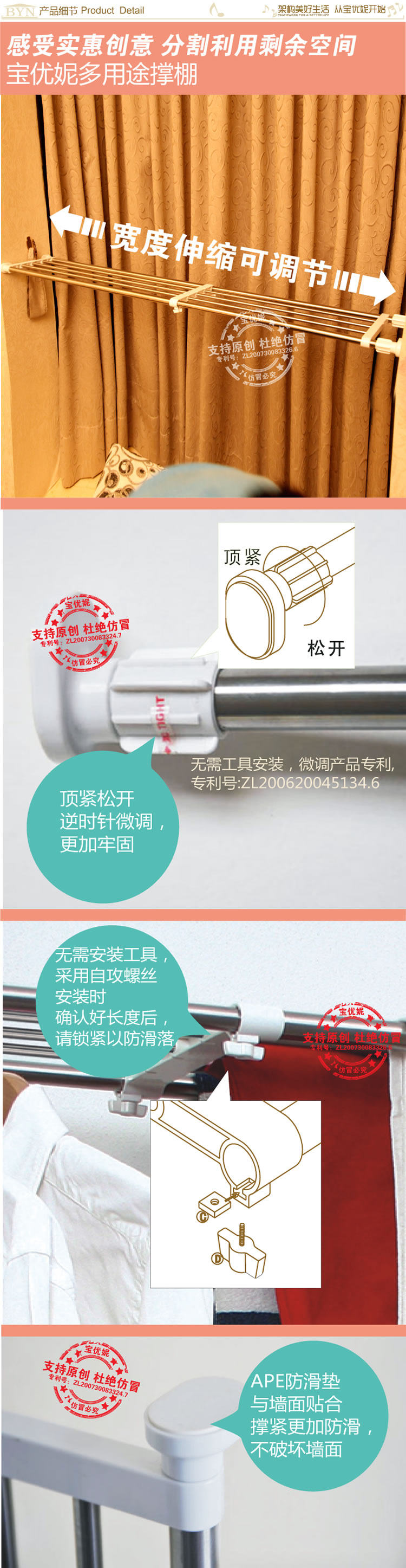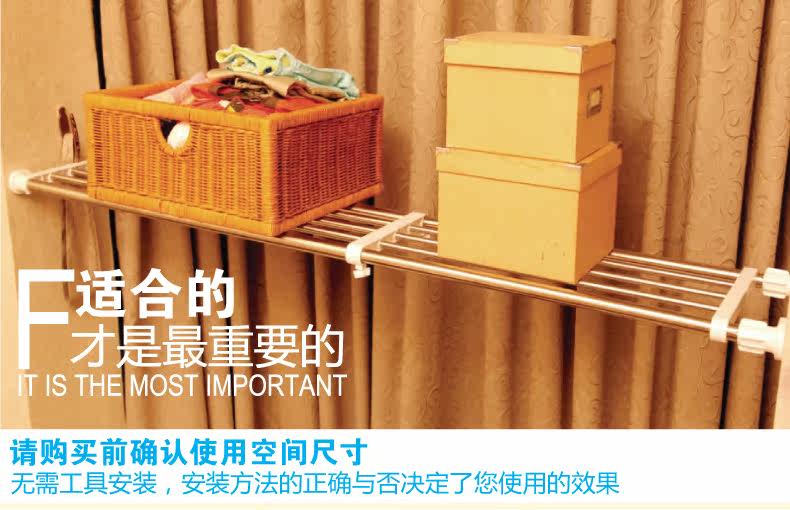 2、利用微调装置,顶紧两侧墙面,无需安装工具,不用在墙体钻孔打钉,简单安装,两端的固定座都带有独特的防滑设计,安装使用稳定牢固。