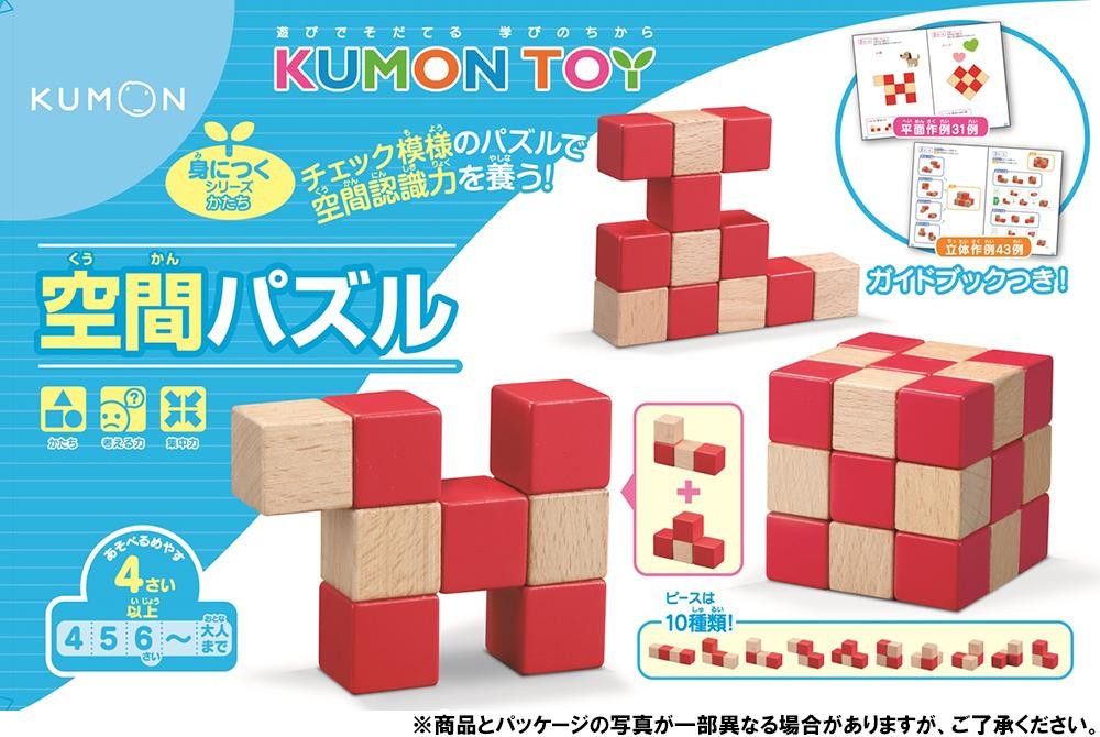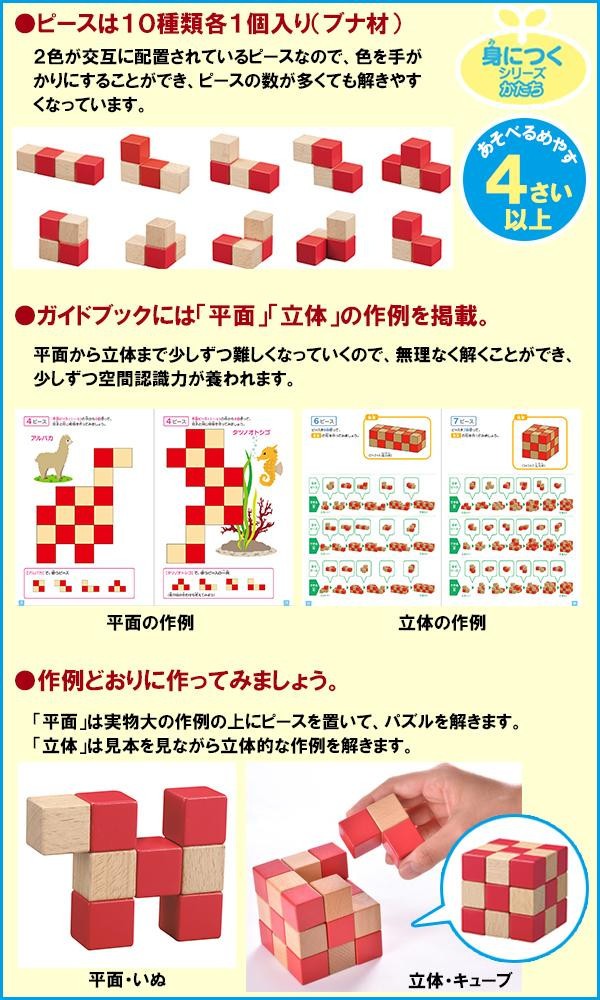 赤と木地のキューブが連結した複雑な形のピースを組み合わせて、指定の平面・立体図形をつくっていくパズルで、空間認識力を養います。パズルが完成すると規則性のあるチェック模様になるので、見た目でも達成感を感じ、正しく組み合わせられたかが自分で確認できます。 |