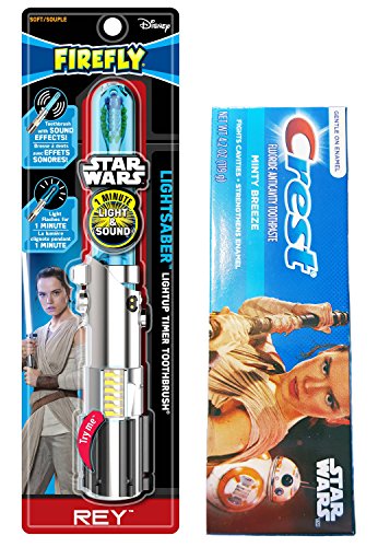 -. Feature : Kids Star Wars Rey Toothbrush Bundle of 2 Items - Lightsaber Light-Up Timer Toothbrush, Minty Breeze Fluoride Toothpaste / Firefly manual lightsaber toothbrush; Light flashes for one minute to help develop good oral care habits / Toothbrush sound effects! Your child will hear Rey speak while brushing as well as fun lightsaber sounds / Crest Minty Breeze Fluoride Anticavity Toothpaste; Helps fight cavities and strengthen enamel / This Star Wars dental kit includes: (1) Lightsaber toothbrush, (1) 4.2 oz tube of toothpaste