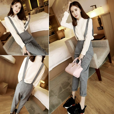 新款韩版减龄百搭显瘦灰色竖条纹背带裤连体裤长裤女学生
