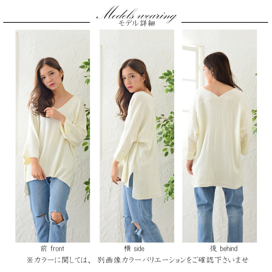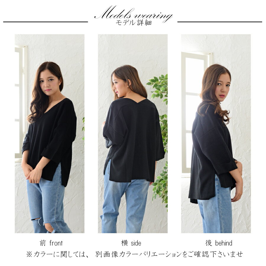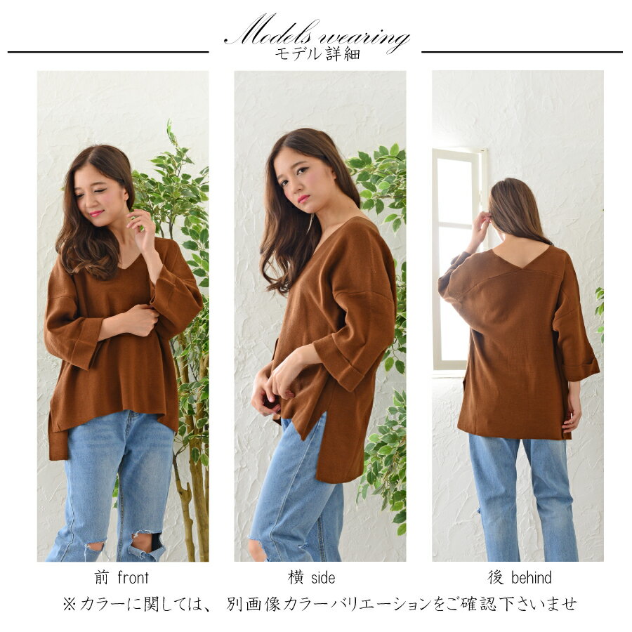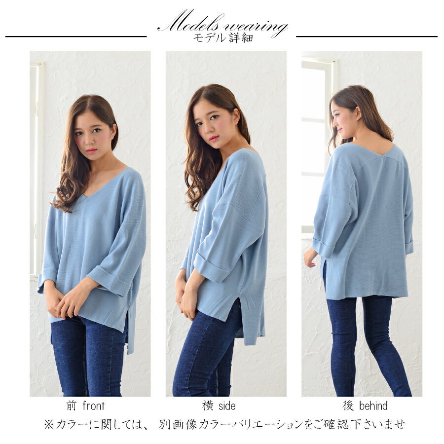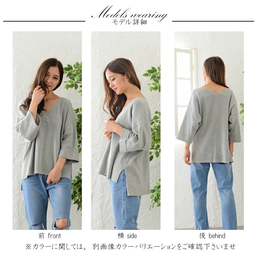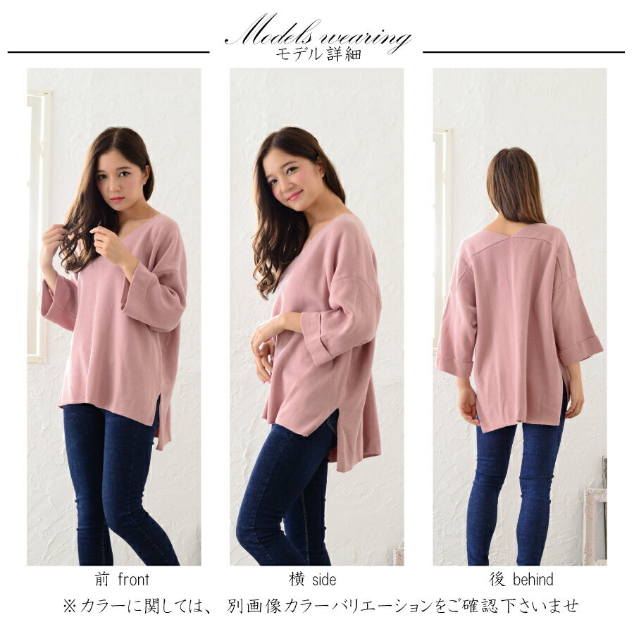 腕をほそく華奢に見せる折り返しデザインの七分袖や、デコルテを美しく演出する広くざっくりと開いたVネックなど、