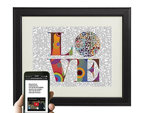 The QR code art print is a perfect paper gift for your first wedding anniversary! All of Me inspired QR code song lyric and video art is one of a kind. Download a free QR reader in your smartphone and simply scan "O", then