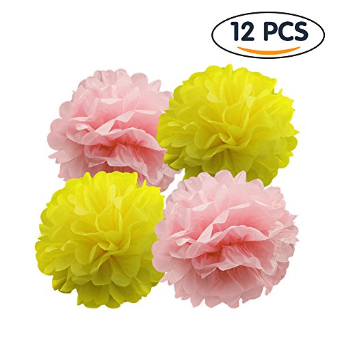 Shintop 12 Pack Tissue Paper Flowers 10 Inch Pom Poms Balls for Party, Birthday, Wedding, Festival Decorated (Pink and Yellow)