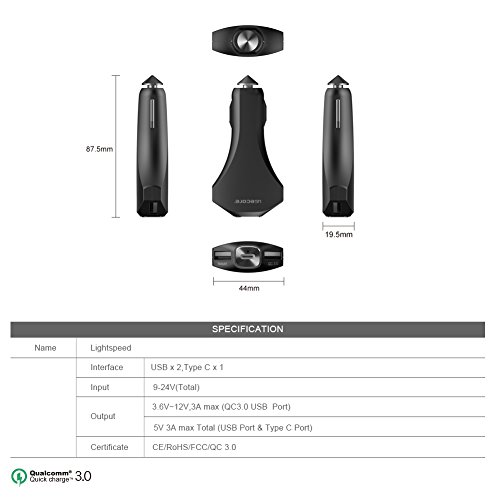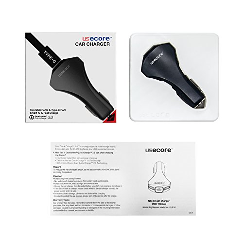 -. Feature : The USecore Car Charger combines 1 smart charging ports, 1 Quick Charge 3.0 port, and 1 USB Type C charging port, meet all your charging needs. / Muti Use: QC 3.0 port charges at a powerful 5V3A/9V2A/12V1.5A and also provides for non-QC devices / Dual QC3.0 USB Ports, to charge 2 compatible devices efficiently with QC3.0 technology, or non-Quick Charge devices; Automatically recognize and detect the optimal charging speed for your devices. / Universal usb car charger for all devices include Apple iPhone 6, 6s, Samsung Galaxy s7, s6 and the latest type c devices such as Nexus 6p, LG G5, HTC 10, OnePlus 2 and more / Built-in safeguards protect your devices against excessive current, overheating, and overcharging