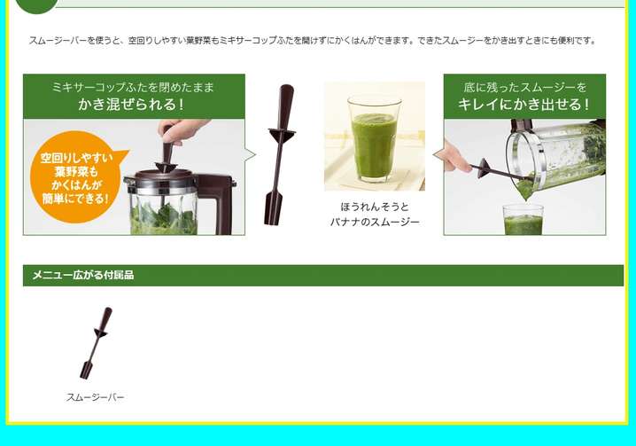 ●空回りしやすい葉野菜もふたを開けずにブレンドできる「スムージーバー」