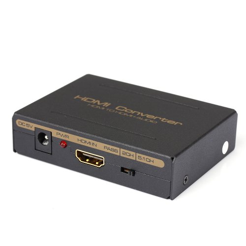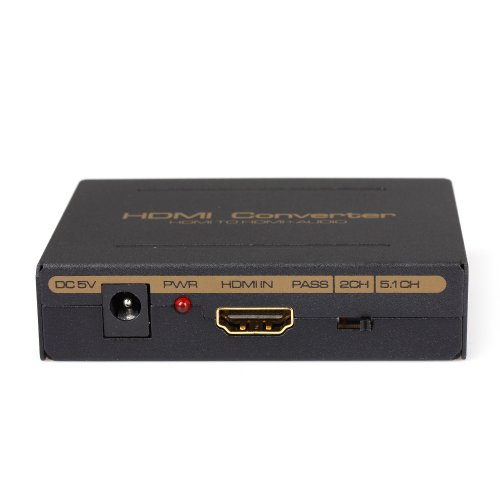 - Feature : Extract the digital audio signal from the HDMI input and convert it to 2 channel analog stereo output or 5.1 channel Audio output / Supports the highest video resolution to 1080p. Supports 225MHz/2.25Gbps per channel bandwidth / Supports 12bit per channel (36bit all channel) deep color. Supports HDCP, Video EDID Pass Through; Plug & Play / Audio EDID Settings: 2CH for L/R or SPDIF stereo output; 5.1CH for SPDIF Output, Supports uncompressed audio such as LPCM. Supports compressed audio such as DTS Digital, Dolby Digital / Provides the Best Flexibility through Three NEW Audio EDID Settings: Pass, 2CH and 5.1CH, Support 3D video (To get 3D, all units connected to the splitter outputs must support 3D). This item supports Apple TV and various Blu-ray player and satellite receivers