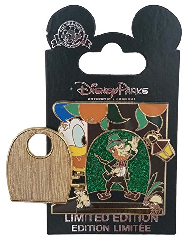- The pin features Donald Duck peaking around an orange tree to see a Leprechaun behind his hinged door, which is held in place by a swivel lantern
