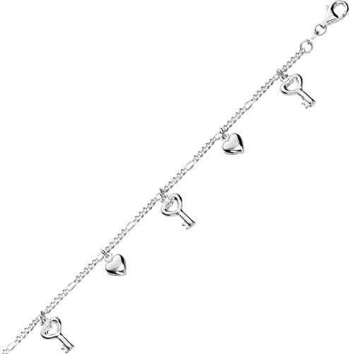 -. Title : 9" Rhodium Plated 925 Sterling Silver Shiny Figaro Type Anklet w/ Pear Shape Clasp & Heart & Key Charm