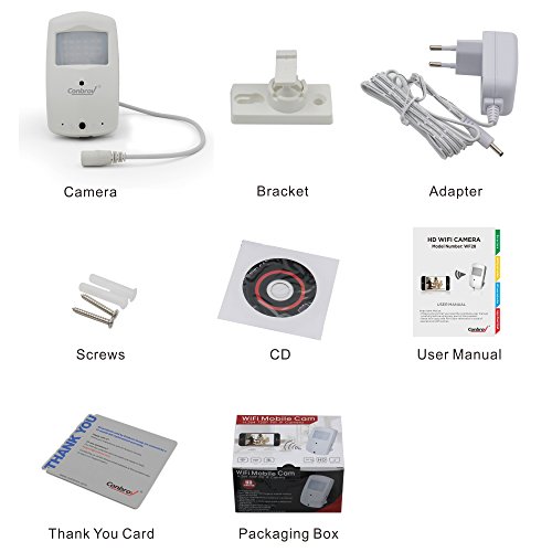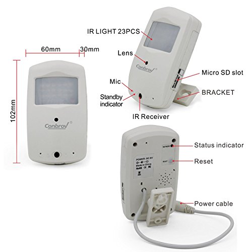 -. Binding : Electronics -. Brand : Conbrov -. Feature : Accurate motion detection up to 24 feet (8 meters) and can through wifi connect to smartphone Accurate motion detection up to 24 feet (8 meters) and can through wifi connect to smartphone USE / Super HD night vision 23pcs LED up to 24 feet for night use / Automatically Loop recording from the oldest file when the Micro sd card is full / Email alerts and pushes function available / A/C Power Supply included for mounted use (extension cable optional) -. Label : Conbrov Group -. Manufacturer : Conbrov Group -. Model : WF28 -. MPN : WF28 -. PackageQuantity : 1 -. PartNumber : WF28 -. ProductGroup : Photography -. ProductTypeName : SURVEILANCE_SYSTEMS -. ProductTypeSubcategory : Mounting bracket -. Publisher : Conbrov Group -. Studio : Conbrov Group -. Title : Conbrov® WF28 HD Wireless Home Wifi Ip Hidden Video Camera Security Nanny Cam with Super Night Vision and Motion Activated Detector Indoor Surveillance Use