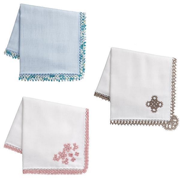 おしゃれで吸水性抜群のハンカチキットを3種類ご用意しました!!ハンカチに穴を開けず、縁についているピコットにタティングを結うだけでエジングハンカチが出来ます。 |