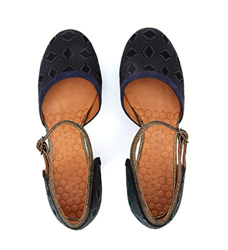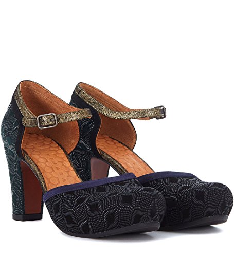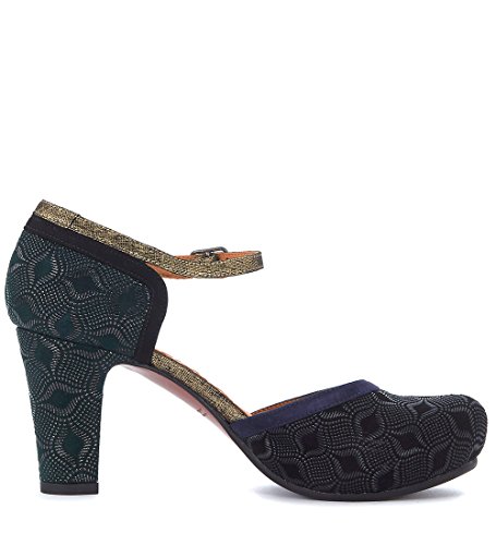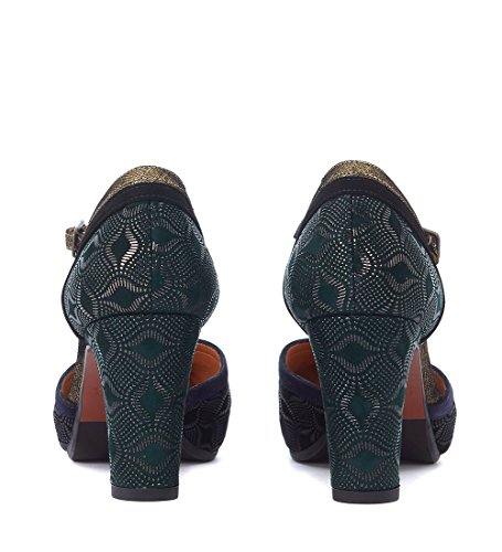 Product Description Decollete Chie Mihara modello Lebon in pelle stampata verde con dettagli in pelle nera, blu e oro. Tacco grosso di 7,5 cm. Made in Spain. 0