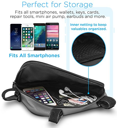 Fits most essentials like smartphones, wallet, keys, small bike pump, cable lock, repair tools etc. (not included)