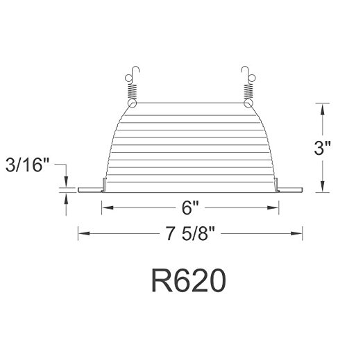 6 Inch Line Voltage Recessed Downlights R-620. Step Baffle. Crafted of one-piece spun aluminum or durable stamped metal, the 6-inch Line Voltage Recessed Downlights are available with full reflector trims that ensure proper lamp position, low glare and superior performance photometric. A variety of styles available for sloped ceilings. Interchangeable lamps. Durable stamped metal construction. Steel spring clips secure lamp to housing. Provided with foam rubber gasket around outer perimeter. Abrasion resistant powder coat paint or plated metal finish. Snap-in socket holders secure and position lamps. Various lamp options available including LED PAR30. Multiple wattage optionsFeature
