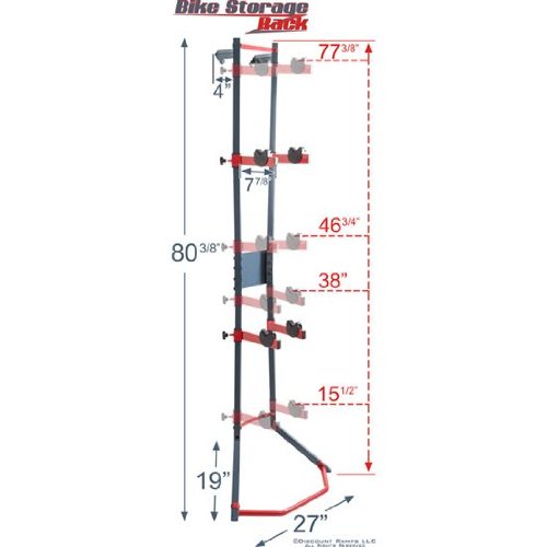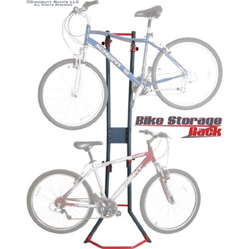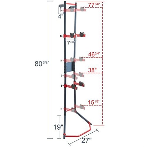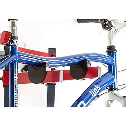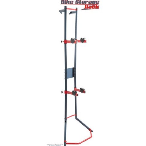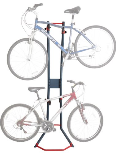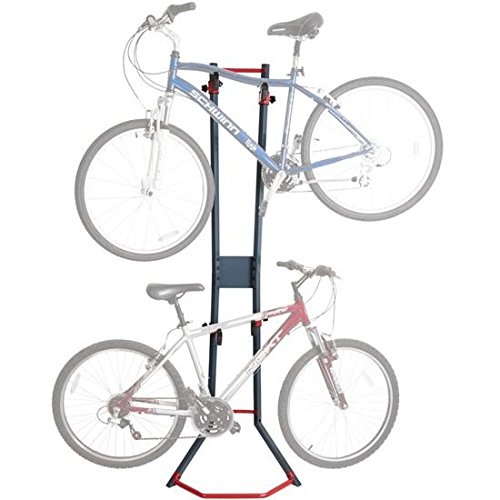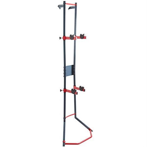Stores (1) or (2) bicycles in a vertical, organized fashion to save valuable space indoors or in a garage or shed - A great way to optimize available space! Includes (2) bicycle hanger arms with plastic holders to protect the bike's frame finish which can be adjusted to one of (4) height positions at 15.5", 38", 46.75" or 77.375" high. Adjustable height positions enable the storage rack to accommodate various sizes of bike models stored together. The bike stand supports up to 88 lbs. maximum capacity when properly installed. Assembly is required prior to use. Each bicycle storage rack is designed to lean against an indoor wall and may be permanently mounted with (2) included wall plates. Mounting screws or lag bolts are not included for stud attachment. Made with reinforced steel construction, finished in a smooth dark blue and red accent for long lasting durability. 0 |