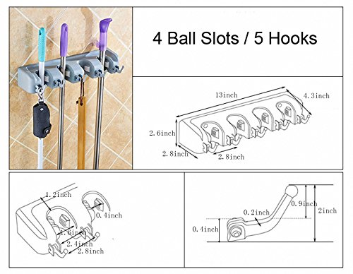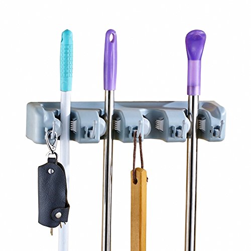 - Space saving Wall Mounted Mop and Broom Holder helps you make tidy and organized garage, garden, kitchen, laundry room. Small space on the wall, holding multiple tools and gadgets as you needed.