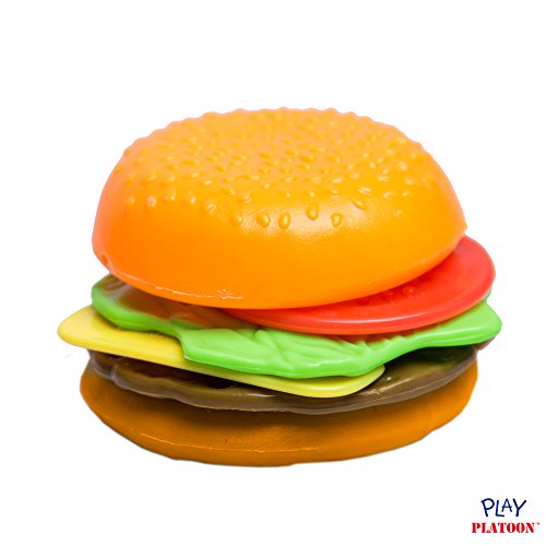 This gigantic 120 Piece Plastic Play Food Toy Set includes a huge variety of foods from all five food groups. Included are: Oranges, Lemons, Bananas, Carrots, Cheese, Chili Peppers, Chocolate Candy, Corn on the Cob, Croissant, Donuts, Egg, French Fries, Hamburger, Hot Dogs, Ice Cream Cones, Juices, Lettuce, Mushrooms, Pea Pods, Pineapple, Pizza, Potato Chips, Red & Green Grapes, Salt & Pepper, Tomato, Various Canned Bottled & Boxed Foods, Watermelon, and much more! Not only that, we've included all the dinnerware you'll need to complete your pretend food dining experience: 2 plates, 2 forks and 2 knives. And if that weren't enough, this play food set also includes a Create-A-Burger kit featuring 2 buns, a hamburger, cheese, lettuce, and tomato.
