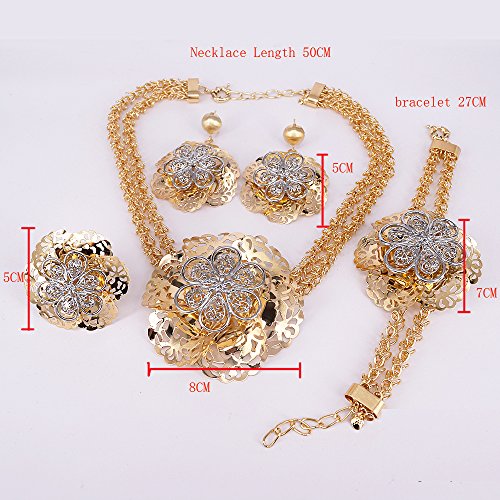 -. Feature : Africa Style 18K Gold Plated Double Chain Large Hollow Flower Jewelry Set of Necklace Earrings Bracelet and Ring / Necklace circle: 19.6 inch;Bracelet: 10 inch long; Ring: open size, fits all; / Shinning, beautiful, luxury looking jewelry set for Celebration, Wedding, party, holiday and Show / Nickel & Lead Free, Gold plated, harmless and hypoallergenic for skin / Ideal gift for your girlfriend, fiancée, wife, mother or friend. A good choice for engagement or wedding jewelry too.