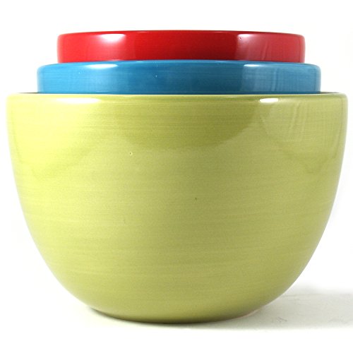 - Set includes a small red bowl, a medium aqua bowl, and a citron large bowl