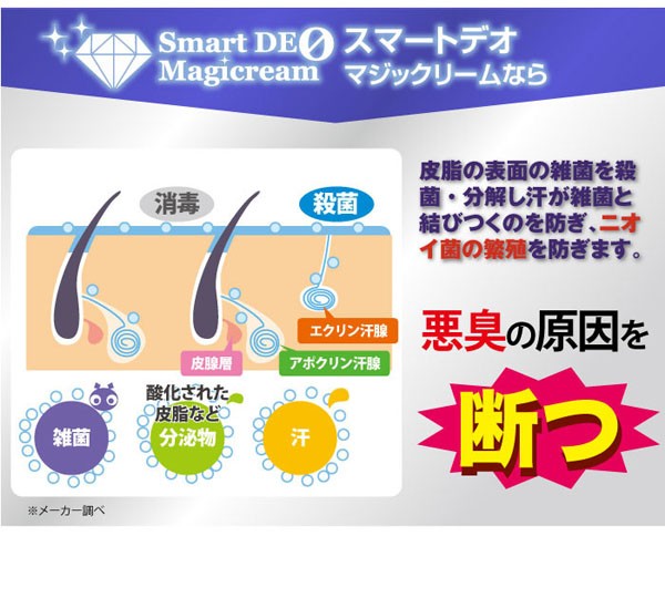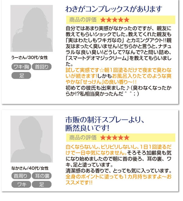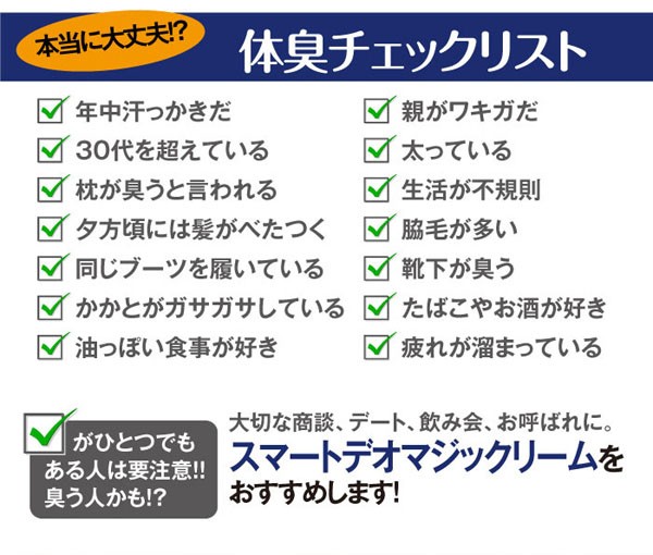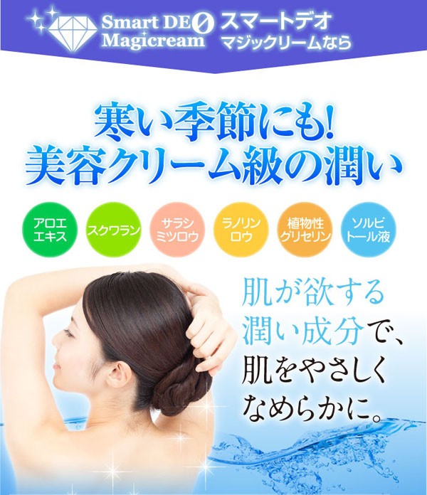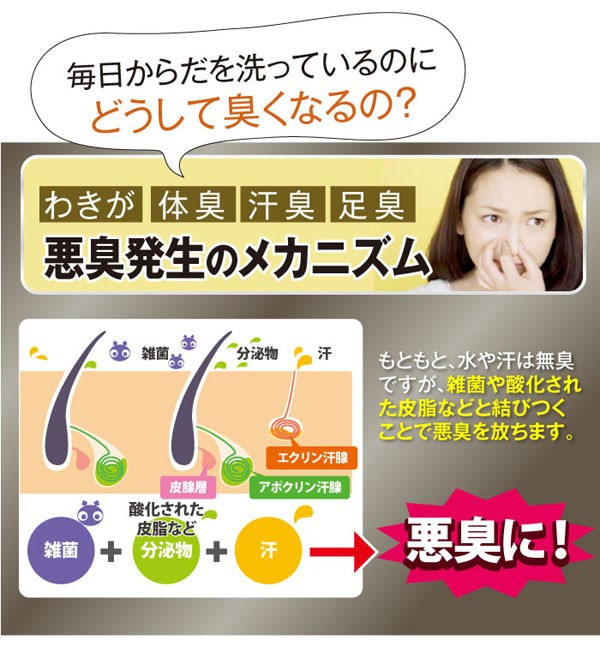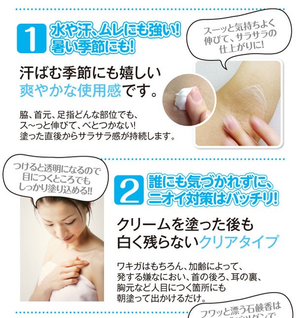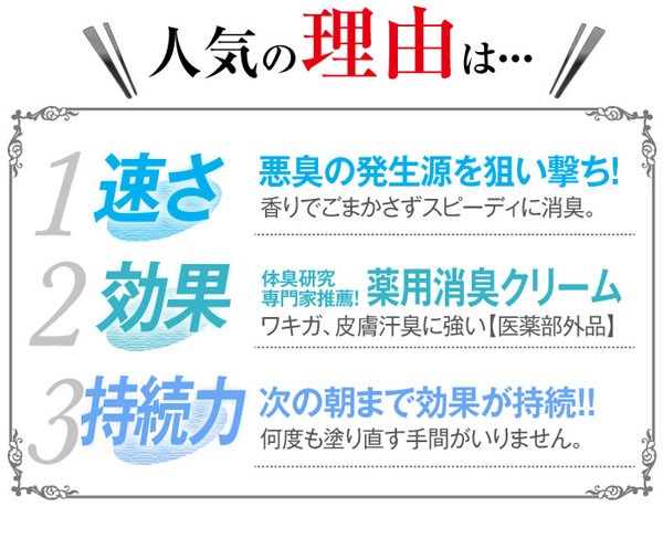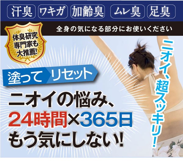 適量を手にとり、わきの下や足など汗のでやすいところ、においが気になるところに塗布してください。 |