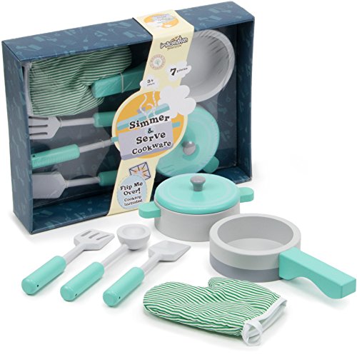 -. Title : Simmer & Serve Cookware Playset with a Pot, Pan, Mitt, & Utensils – Compatible with Kids Kitchens & Play Food Toy Sets (7pcs.) by Imagination Generation
