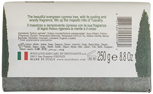 -. Binding : Health and Beauty -. Brand : Nesti Dante -. Color : White -. Department : unisex-adult -. EAN : 0837524000182 -. Feature : 250 g bar / cypress / Country of origin: Italy / Please read all label information on delivery. -. IsAdultProduct : 0 -. Label : Nesti Dante -. Manufacturer : Nesti Dante -. Model : 1755106 -. MPN : 1755106 -. PackageQuantity : 1 -. PartNumber : 1755106 -. ProductGroup : Beauty -. ProductTypeName : BEAUTY -. Publisher : Nesti Dante -. Size : 250g/8.8oz -. Studio : Nesti Dante -. Title : Nesti Dante Cypress Tree Soap 250 g bar -. UPC : 837524000182