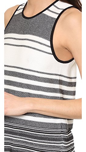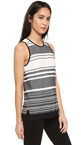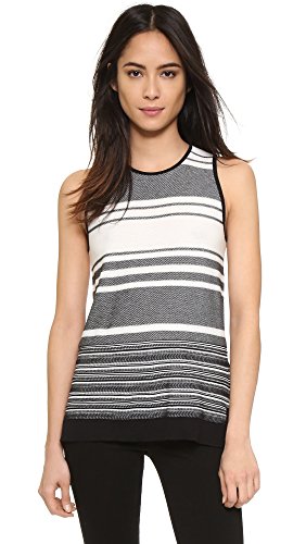 Patterned stripes add a lively touch to this inside-out knit Vince sweater. Banded neckline arm openings. Sleeveless.